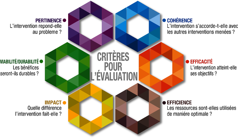 Le guide IDEAS demande d’intégrer l’évaluation selon les critères de pertinence, de cohérence, d’efficacité et d’impact. Ces critères sont issus des travaux de l’OCDE et permettent de déterminer l’intérêt ou la valeur d’une action ou d’une intervention.